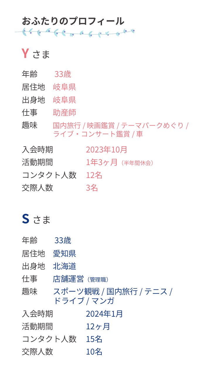 Yさま:私からです。実は半年休会していて、再開してすぐのタイミングでした。以前は自分の父親に似た真面目な方ばかりと会っていたら、疲れてしまって…。再開時は方向性を変え、「人当たりがよくて、自然体で話せそうな人」にしようと思いました。Sさんはプロフィール写真の笑顔が素敵で、人の良さがにじみ出ていたので申し込みました。